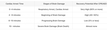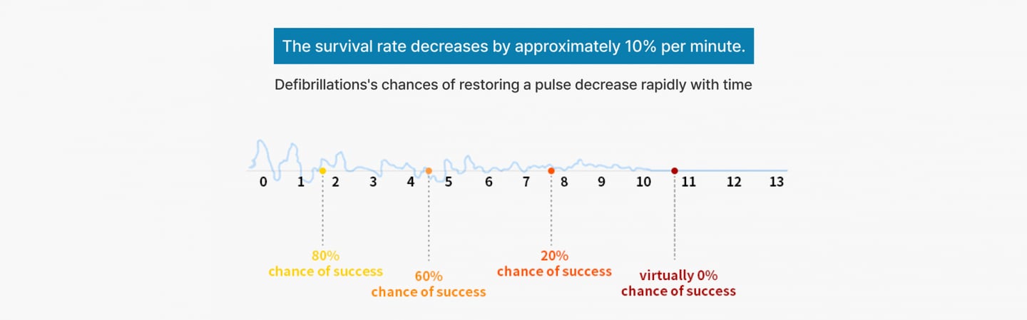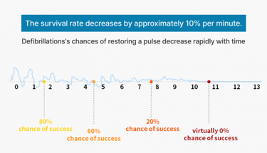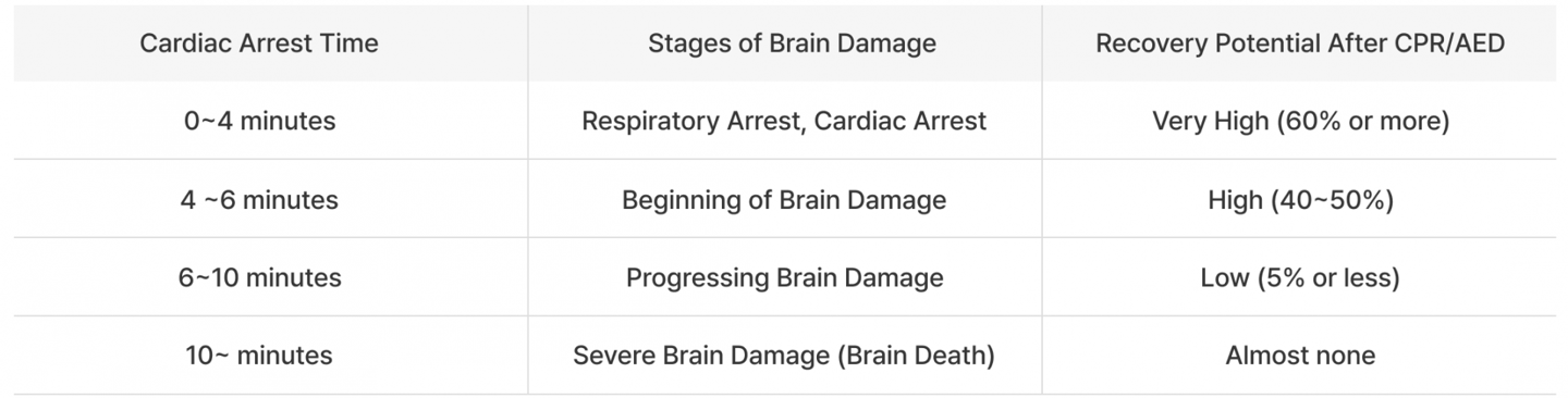 In the event of cardiac arrest, the heart stops, and oxygen is no longer supplied to the brain and heart. Without prompt treatment, brain damage begins within 4 minutes, and death can occur within 10 minutes. To prevent heart damage and brain death in emergency situations, early CPR (Cardiopulmonary Resuscitation) and the use of an AED (Automatic External Defibrillator) are crucial. Without them, the survival rate decreases by approximately 7-10% for every minute that passes beyond 5 minutes.